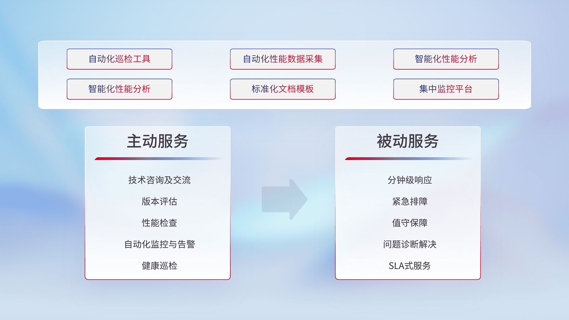智能化工具和标准化文档,,,,保障服务质量,,,提供主动服务(包含技术咨询、、版本评估、、性能检查、、、自动化监控与告警、、、、健康巡检)和被动服务包含(分钟级响应、、紧急排障、、值守保障、、问题诊断解决、、SLA服务)。。