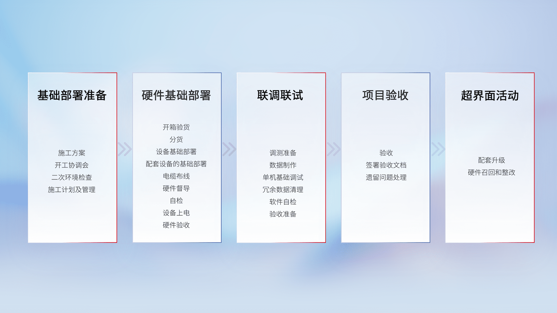 从基础部署准备、、硬件基础部署、、、、联调联试、、项目验收、、、、越界面活动的全过程可追溯,,保证施工质量和进度。。。。