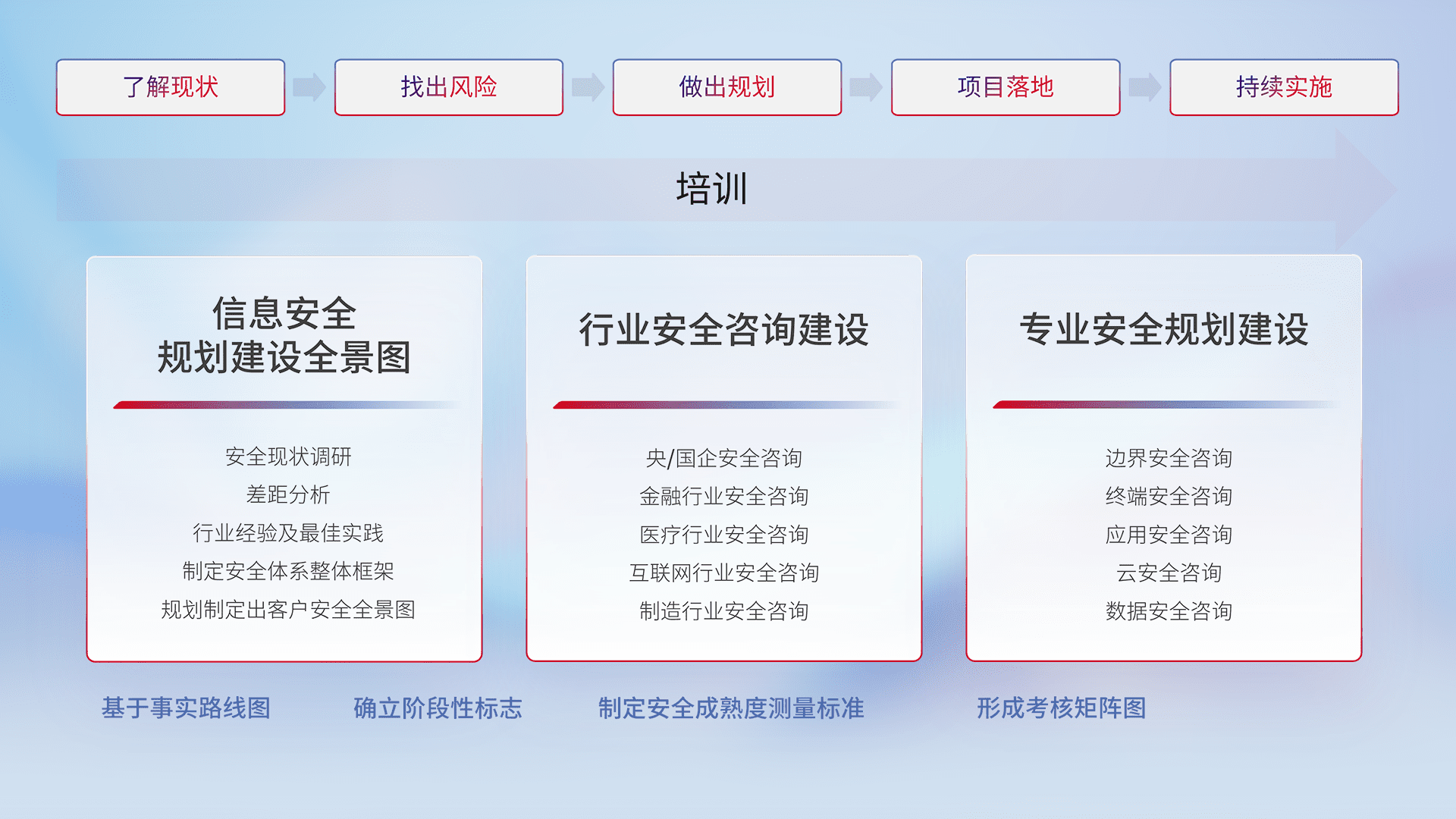 梳理客户信息安全现状调研、、差距分析结果,,,结合行业先进经验及最佳实践,,制订客户的信息安全管控体系总结架构,,最终形成一个完整的客户信息安全规划与建设的全景图。。