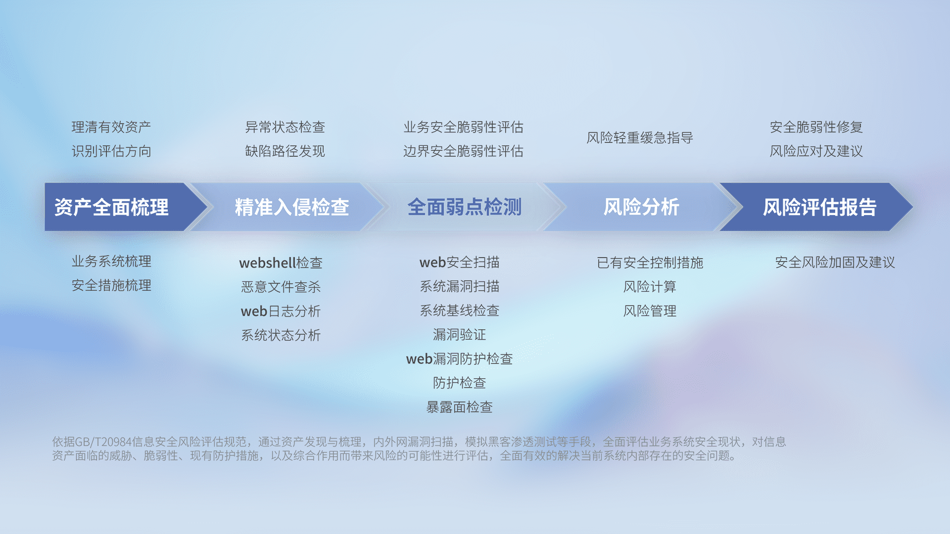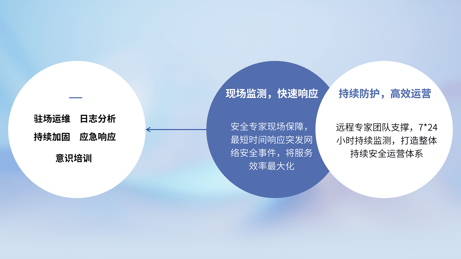 针对客户行业特性,,,以专业的安全服务+多厂商联合解决方案提供专属的一站式安全管理服务,,,帮助客户全面感知网络空间威胁,,,基于识别、、检测、、、分析、、、、防护、、监测、、、、响应的服务理论模型,,从方案咨询、、、、集成交付、、、、评估验证、、、、优化加固、、运维运营,,,致力于为客户提供完整的闭环管理式安全服务。。。以实战经验为客户打造高抵御风险的安全体系,,,帮助客户发现威胁、、、对抗威胁、、、处置威胁,,不断积累安全对抗能力,,持续保障数字化安全。。。。